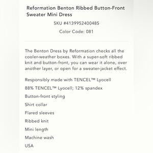 Reformation Benton Ribbed Button-Front Sweater Mini Dress Size XS NWT