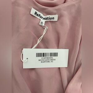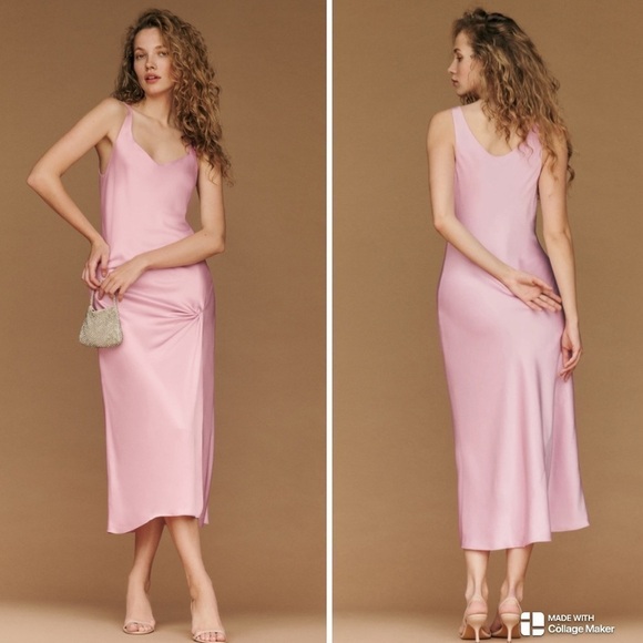 How fancy. Shop the Bevin Satin Dress from Reformation, a relaxed fit, sleeveless, midi length dress. It features a v neckline and a side slit.