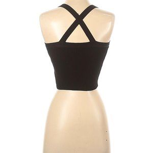 Stylish black crop top. Features a square neckline and thick straps. Perfect for casual wear.