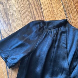 Reformation Black Deep V Romper, Sz 4P, Short sleeves, hidden back zipper, hidden front pockets. Satin like fabric. Measurements (approximate), fabric content and cleaning instructions pictured. Worn Once.
