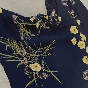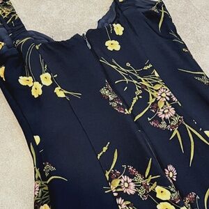 Elegant black midi dress with floral print. Features a stylish slit. Perfect for any occasion.