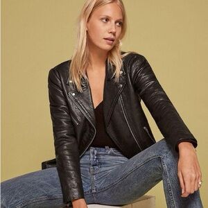 Chic black leather jacket with silver zippers. Stylish and versatile for any wardrobe.