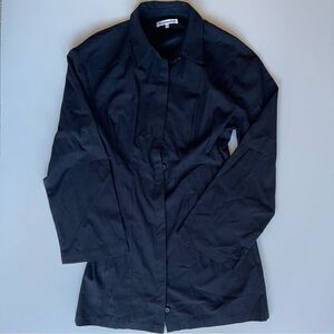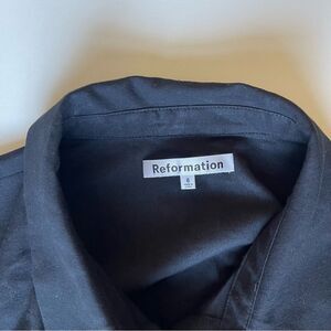 Elegant black mini dress. Features long sleeves and a collared neckline. Perfect for any occasion.