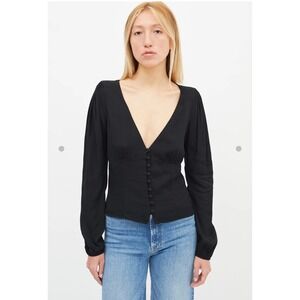 Reformation Nell top in black featuring V-neckline, buttons closure at front, and long sleeves.