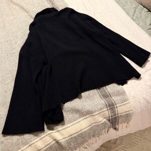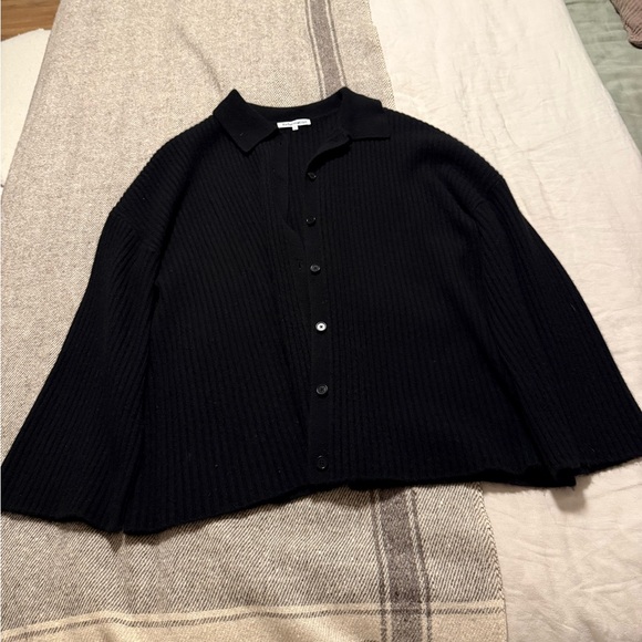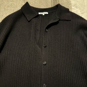 Soft ribbed knit. Button-front with small collar. Relaxed, boxy silhouette. Versatile wardrobe staple.