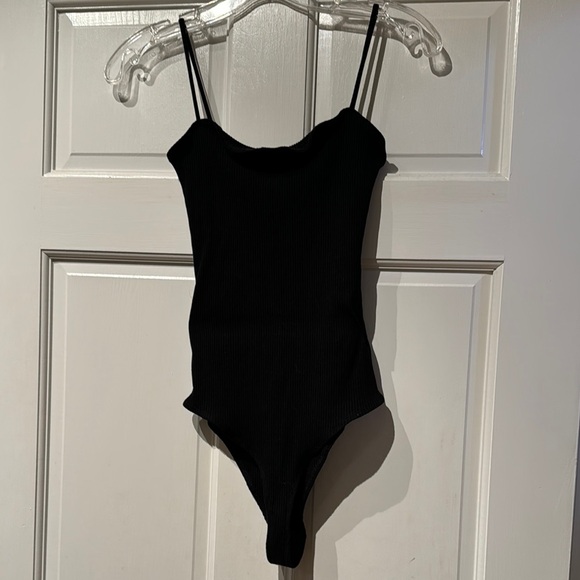 Stylish black ribbed one piece. Features thin straps. Perfect for any occasion.