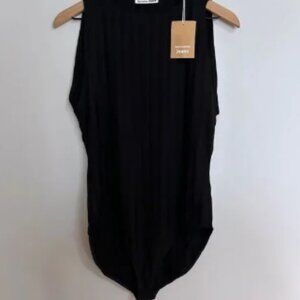 Details: Purchased from Nordstrom and never wore. Purchased for $68. Reformation creates effortless, versatile staples you're guaranteed to reach for time and again. The perfect foundation for so many outfits, this 'Bells' bodysuit is cut from stretch-TENCEL™ Lyocell that’s mindfully made using renewable wood materials. The black color goes with everything and the wide ribbing enhances the close fit. 2nd and 3rd modeled photos are of the bodysuit in Ivory. This listing is for a black bodysuit.