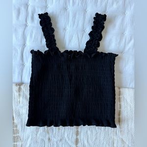 Chic black top with ruffle straps. Smocked design. Perfect for casual outings.