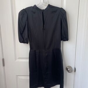 100% silk black mini-dress with capped sleeves. Zippers and clasping buttons on back. Excellent used condition. Worn once.