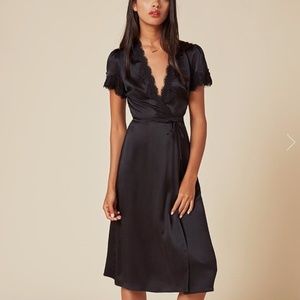 Reformation Black Silk Wrap Dress with Lace Trim
