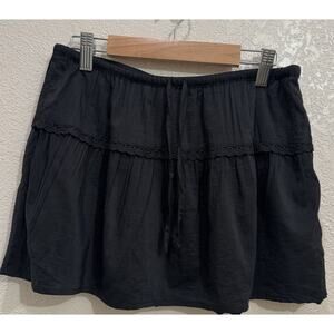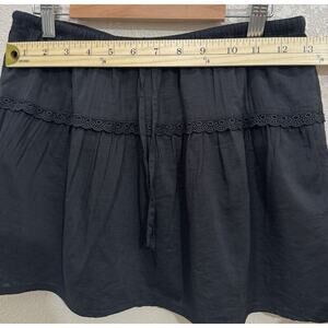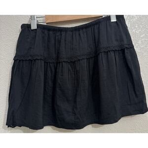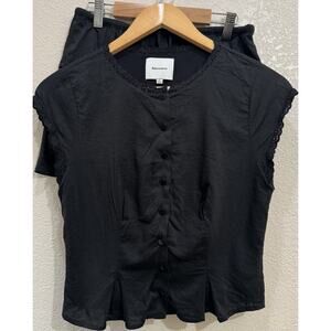 Chic black skirt set. Features button-up top with lace trim. Matching skirt with lace detail. Perfect for stylish outings.