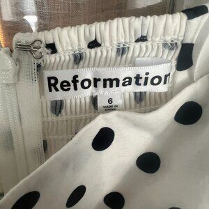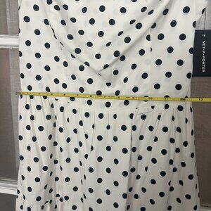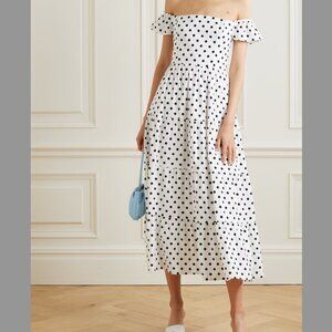 Chic midi dress with playful polka dots. Features a square neckline and short puff sleeves. Perfect for any occasion.
