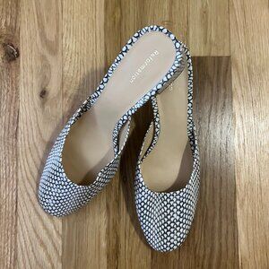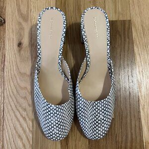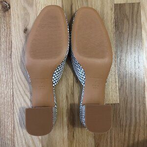 These are snake print leather block heeled mules, about 1-inch heel. I never wore these outside so they're in excellent condition.