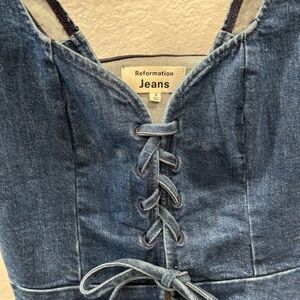 Reformation's blue denim corset top is crafted from high-quality denim offering a blend of style and sustainability. Corset top with adjustable straps