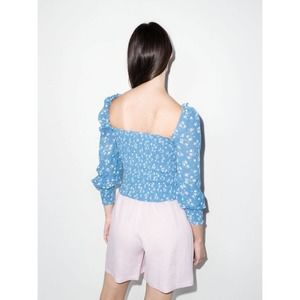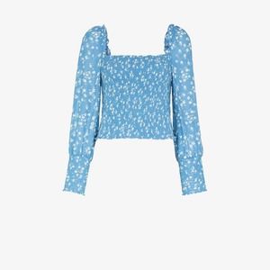 Chic blue blouse with floral pattern. Square neckline. Long puff sleeves. Smocked bodice.