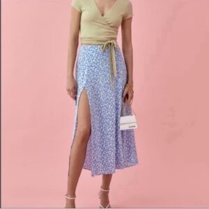 Chic blue floral skirt with side slit. Perfect for casual outings.