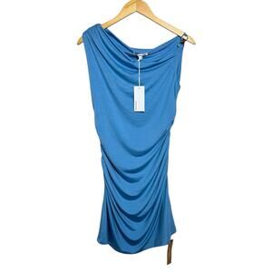 Elegant blue midi dress. Features off-shoulder design. Perfect for any occasion.