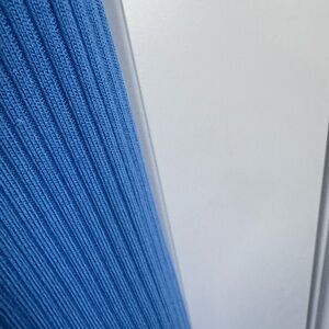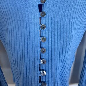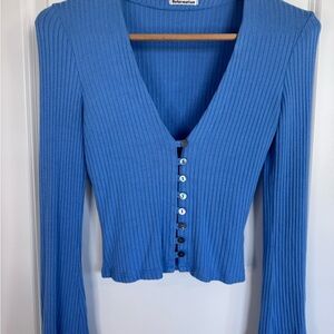 Flattering and feminine Reformation ribbed knit top in a stunning vibrant blue. Features a deep V-neckline with delicate button-front detail and a fitted silhouette that hugs in all the right places. Soft, stretchy ribbed fabric makes it comfortable while still looking polished. Tiny little snag in the top as shown in picture