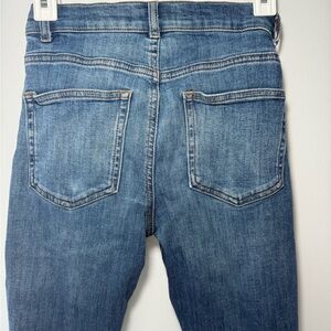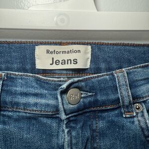 These Reformation jeans feature a classic straight leg design in a medium to dark blue wash, offering a timeless and versatile look. The denim showcases subtle fading patterns for a naturally worn-in appearance, perfect for everyday wear. Crafted from traditional denim material, these jeans provide both style and comfort.