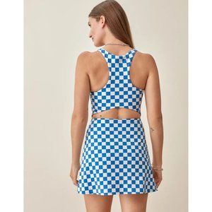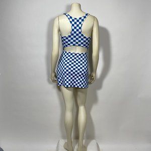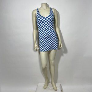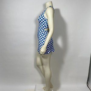 Stylish mini dress with a blue and white checkered pattern. Sleeveless design. Perfect for casual outings.