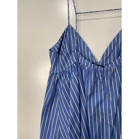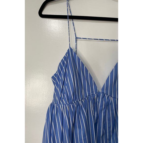 Chic mini dress with blue and white stripes. Features a deep V-neck and adjustable straps. Perfect for summer outings.