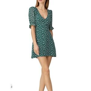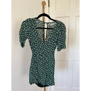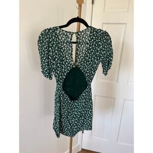 Slim-fitting throughout the bodice and skirt, this very chic REFORMATION dress is styled with a V-neckline, a center back cutout, and cute short sleeves.