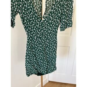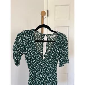 Green floral printed woven viscose (100% Viscose). Hourglass. Short sleeves. V-neckline. Center back buttons with keyhole and center back zipper on skirt. Partially lined.. Made in the USA.