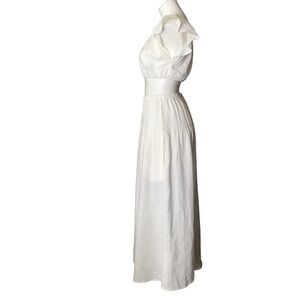 This two-piece set with an off the shoulder cropped top and a maxi skirt. This light weight linen, delicate and very feminine top has flutter sleeves, ruffle neckline, skirt has two side pockets elastic waistband Size L