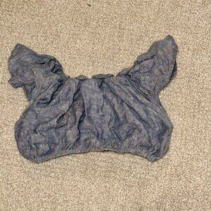 Maybe take some of those vacation days. This is a two-piece set with an off-the-shoulder crop top and a maxi skirt with pockets! Beautiful blue-grey linen fabric. Worn twice.