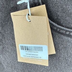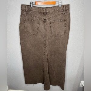Stylish brown denim maxi skirt with front slit. Perfect for casual outings.
