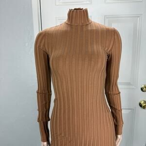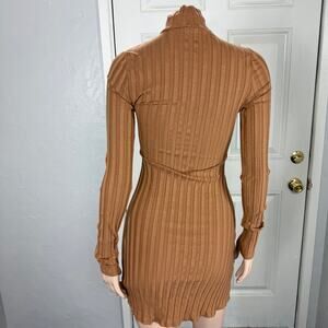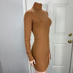 Chic ribbed mini dress. High neckline. Long sleeves. Side slit detail.