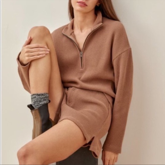 Cozy ribbed pajama set. Features a half-zip top. Relaxed fit shorts. Perfect for lounging.