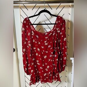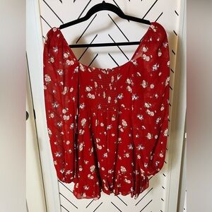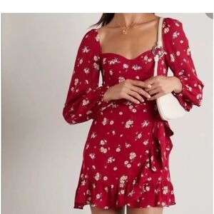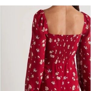 This elegant dress by Reformation features a striking red and white color palette, perfect for a wedding guest or cocktail event. The fit and flare silhouette is enhanced by a square neckline and long bishop sleeves, while the ruffled, tiered skirt adds a playful touch.