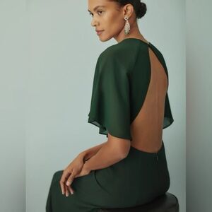 “Wear the dress. The Carletta is an ankle length dress with a crew neckline and an open back. It features flutter details throughout the sleeves and an asymmetrical hemline. The dress is fitted in the bodice with a relaxed fitting skirt, so you get structure and comfort all in one.”