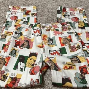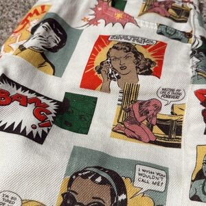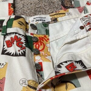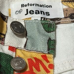 These Reformation cartoon jeans feature a whimsical print in vibrant green and red hues, perfect for adding a touch of fun to your wardrobe.