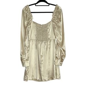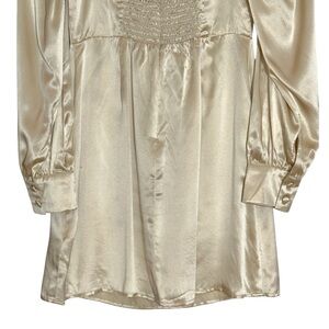 Reformation •100% Silk •Button Sleeve Closure •Long Sleeve •Unlined •Mini Dress •Champagne Color •Romantic •Date Night •Holidays •Cocktail •Proposal •Smocked Back •Almond Color Name