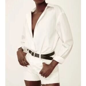 Stylish white button-up shirt paired with matching shorts. Perfect for a chic, casual look.