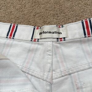Reformation Denim Shorts - Charlie Style - High Rise - 5 Button Up Closure - Grenada Wash - White Wash with Red and Blue Stripes - Size 31 - Minimal Stretch - 100% Cotton - No Flaws - Excellent Used Condition!