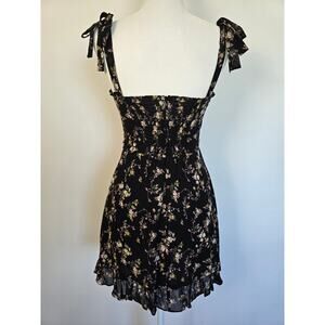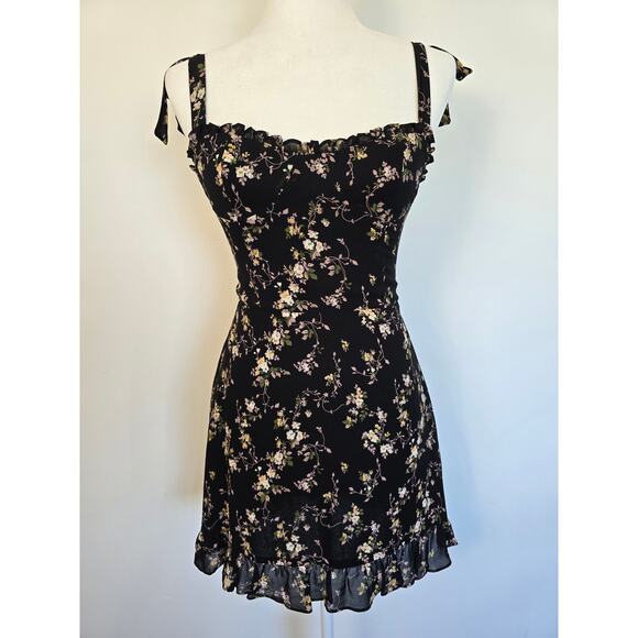 Reformation Christine Black Floral Mini Dress Sz 4 — Ruffled Hem & Tie Straps
