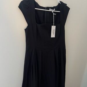 Chic black midi dress with a square neckline. Cap sleeves and a flowing skirt. Perfect for versatile styling.