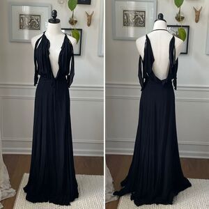 Reformation Cordelia black romantic flowing full wrap, formal gown. Plunging neckline (but I left the pin used to secure it a little more modestly just in case you prefer). This is a lightweight georgette fabric with a dry handfeel - 100% viscose. Double layer. Floor length approx 62” shoulder to hem. Please note the bust and waist Measurements are flexible as this is a true wrap dress. Tag size 8. $328 retail. Freshly drycleaned.