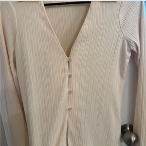 Chic cream button-down shirt by Reformation. Features ribbed texture and long sleeves. Ideal for versatile styling.