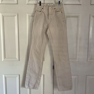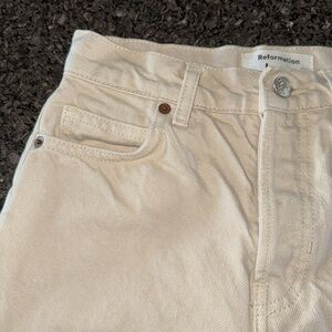 Reformation cream Cynthia high rise straight long jeans. 5 pocket detail. Button fly closure. Size 24. 12 3/4” waist across top laid flat. 11” rise. 33” inseam. Very good pre owned condition