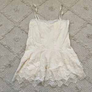 Elegant cream mini dress with lace details. Features a square neckline and delicate straps. Perfect for a chic look.