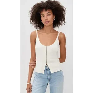 Sleeveless ribbed knit tank with a scoop neckline. Center button-front closure and slight front slit. Slim, fitted silhouette. Lightweight and versatile for layering.