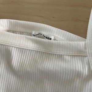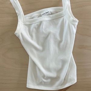 Stylish cream ribbed tank top. Features a square neckline and wide straps. Perfect for layering or wearing alone.