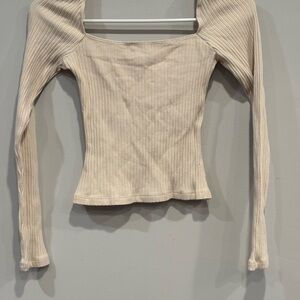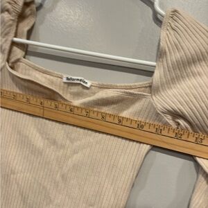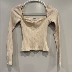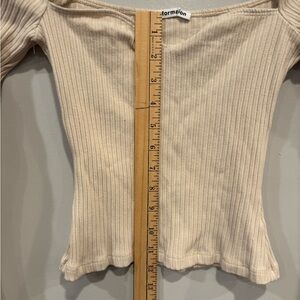 Chic cream ribbed bodysuit. Features a flattering neckline. Ideal for versatile styling.