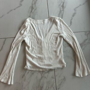 Slim ribbed knit top with a deep V-neck. Button-front closure with tonal buttons. Long sleeves with a slight flare at the cuffs. Soft cream shade that layers easily.