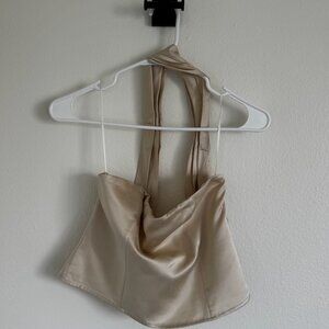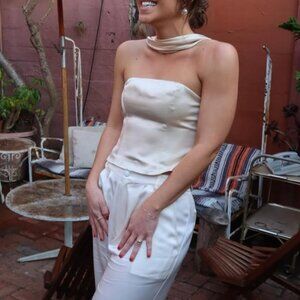 Elegant cream strapless top. Features a sleek design. Perfect for any occasion.