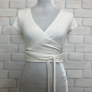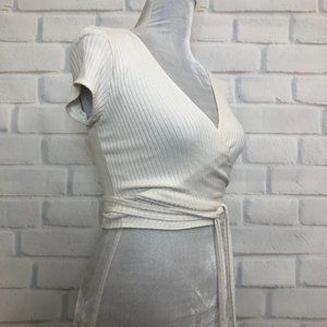Elegant wrap top with short sleeves. Features a flattering V-neckline. Soft ribbed texture. Perfect for casual or dressy occasions.